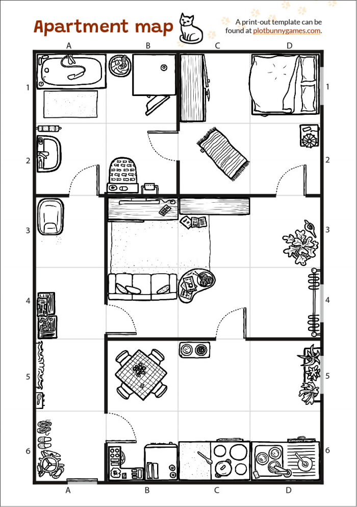 Das Spiel basiert auf einer liebevoll-detaillierten Wohnungskarte mit 24 Feldern, die die Katze besuchen und mit denen sie interagieren kann. So kombiniert es Hexcrawl-ähnliche Mechaniken mit Erzählspiel. Zusätzlich gibt es zahlreiche Listen mit Details und Ideen für eure Beschreibungen.