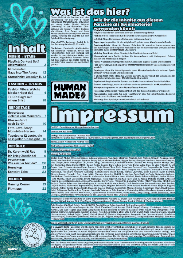 DARVO – Das ultimative Monsterhearts-Fanzine wurde von Jasmin Neitzel und Andrea Rick geschrieben und von Andrea Rick layoutet (weitere Credits findet ihr weiter unten auf dieser Seite).