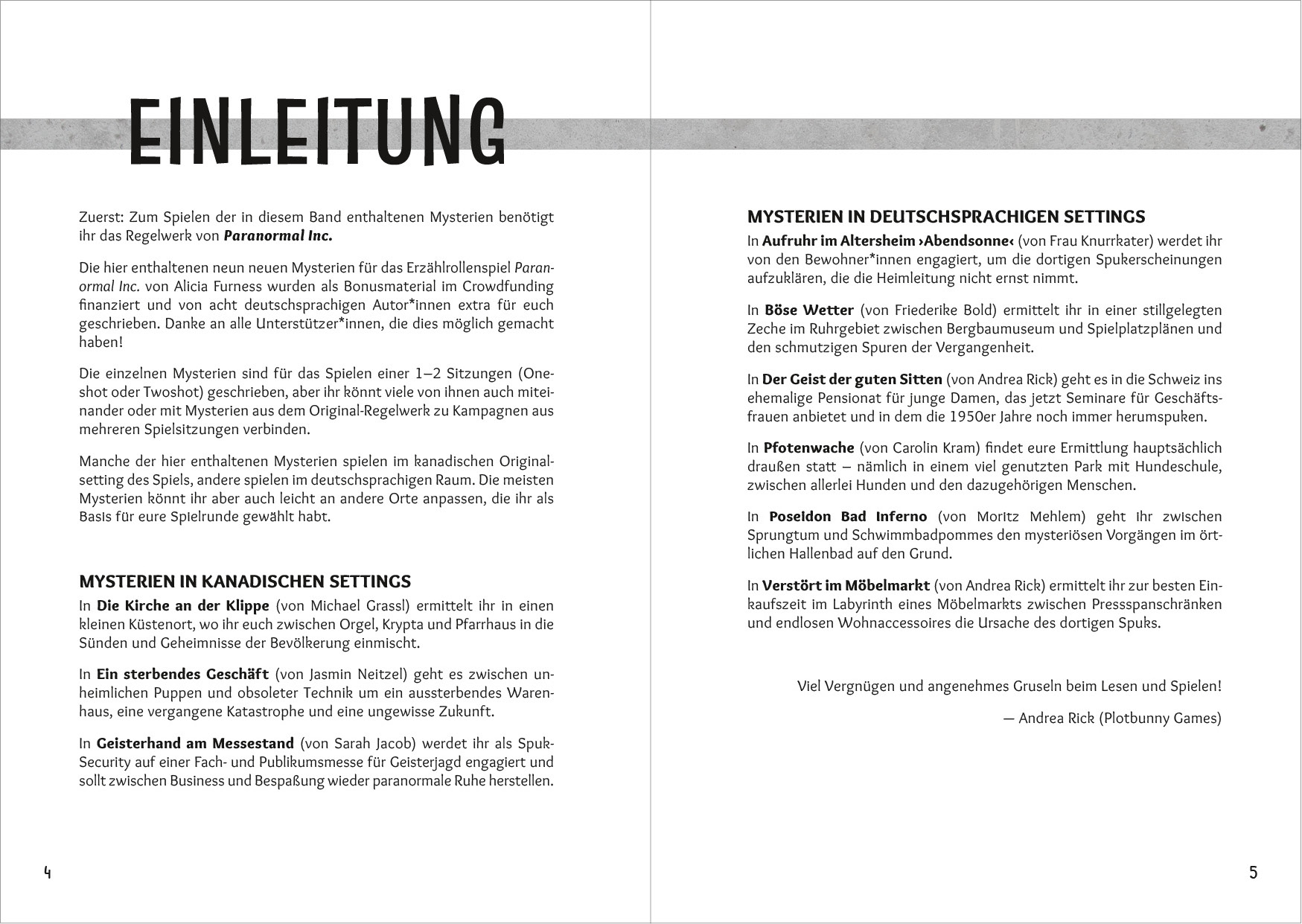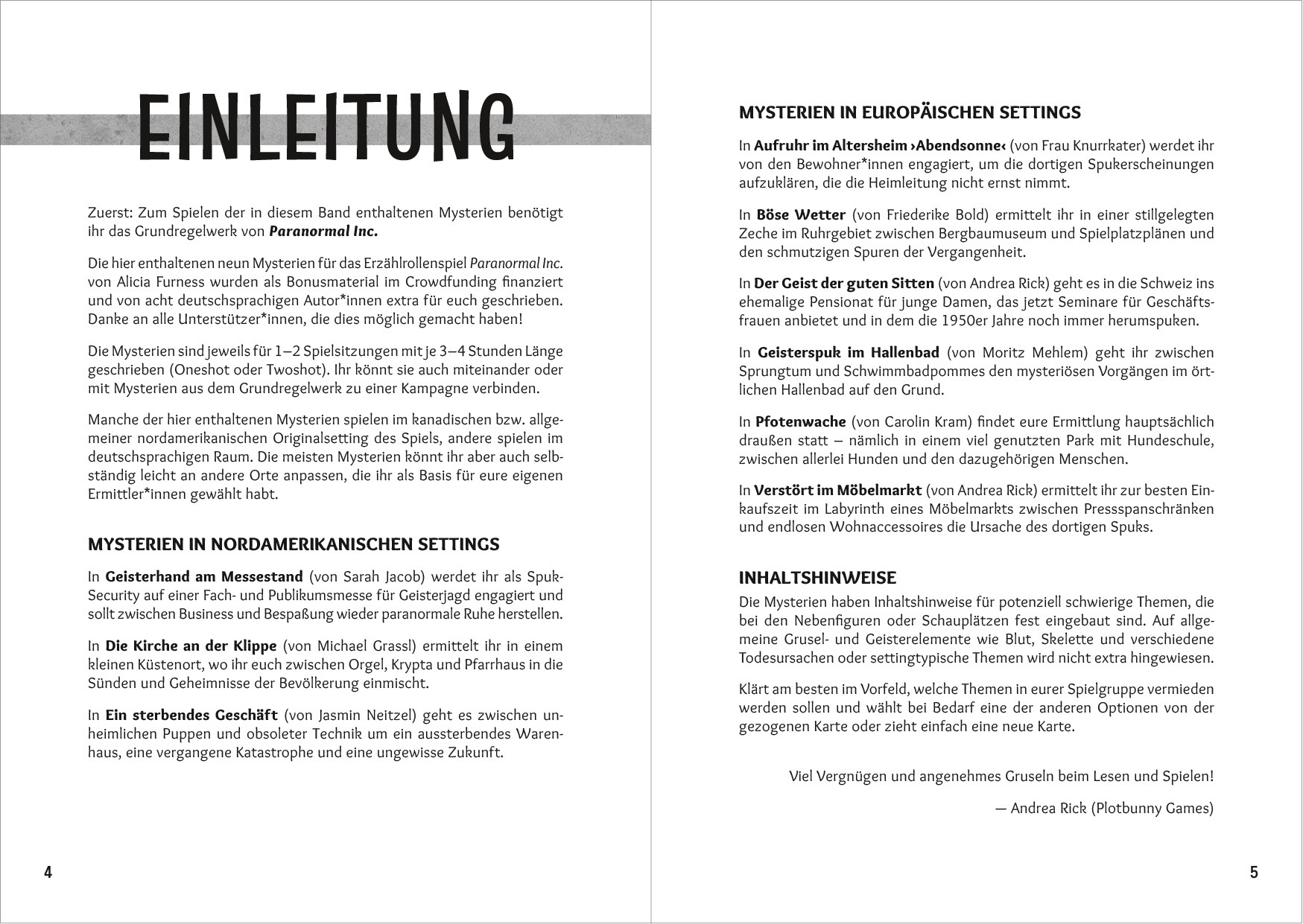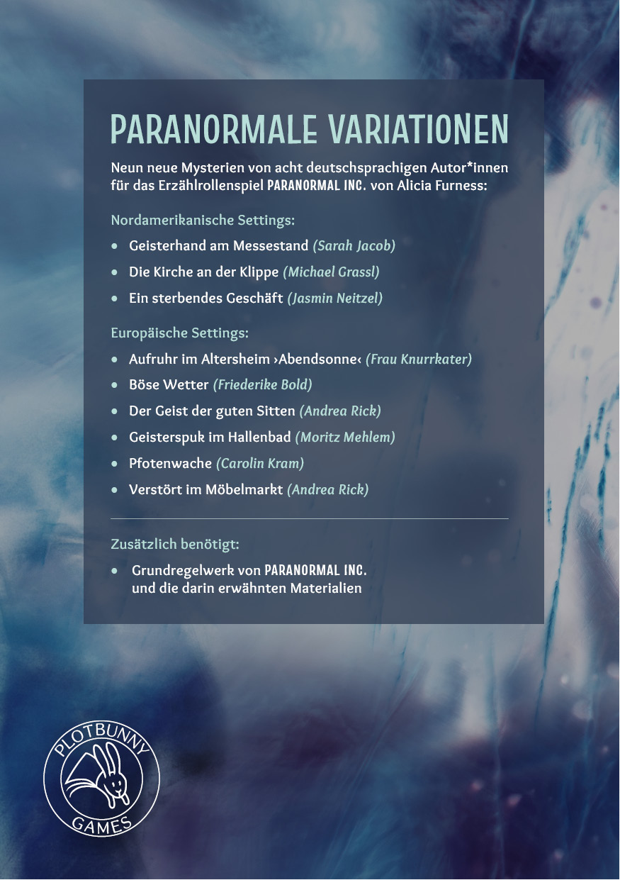 Zusätzlich zum Grundregelwerk von Paranormal Inc. gibt es hier neun zusätzliche Mysterien von acht deutschsprachigen Autor*innen. Diese Zusatz-Mysterien wurden als Bonusziele im Crowdfunding finanziert.
