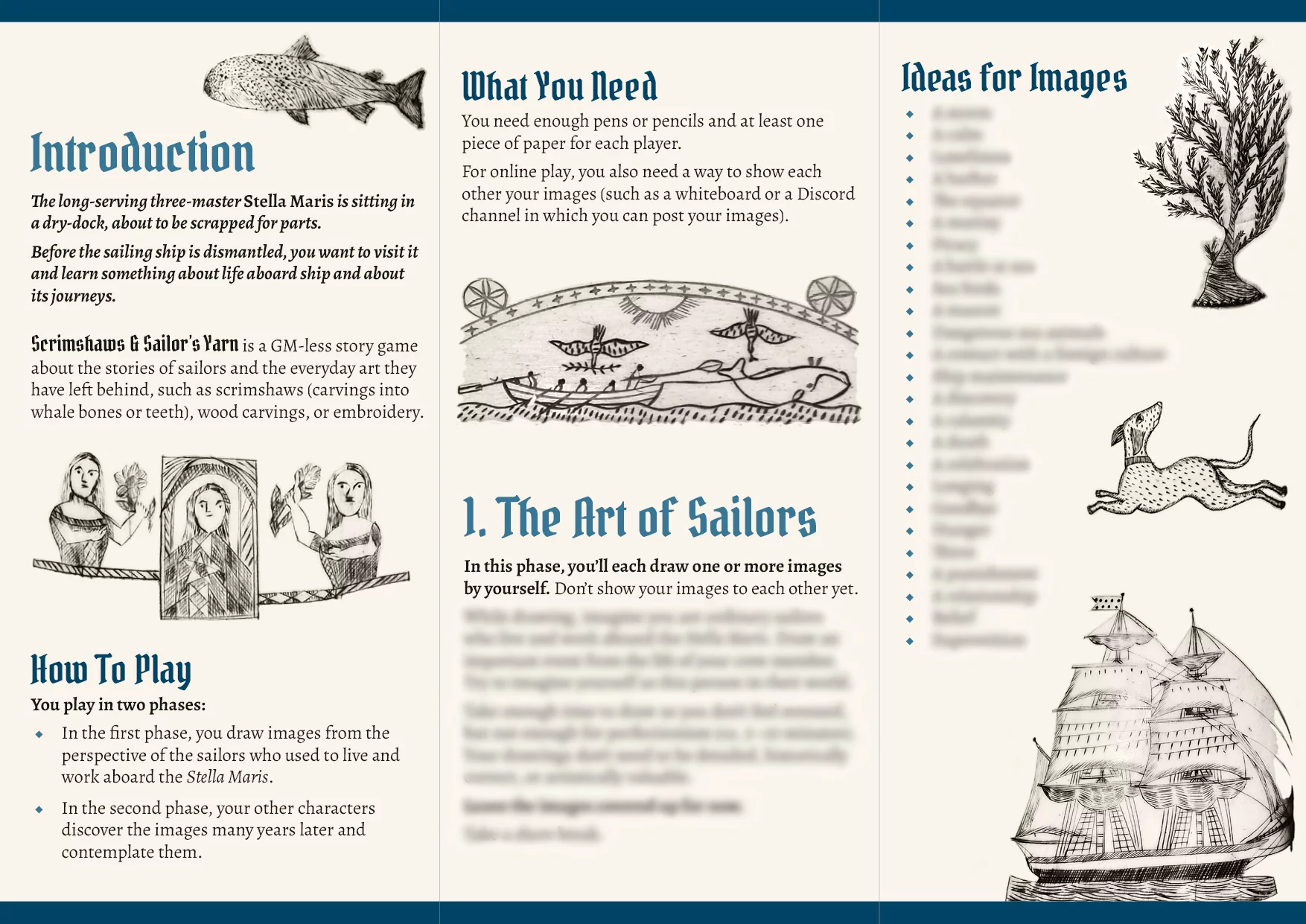 Scrimshaws & Sailor’s Yarn is a rules-light narrative game about the stories of sailors and the everyday art they have left behind, such as scrimshaws (carvings into whale bones or teeth), wood carvings, or embroidery.
